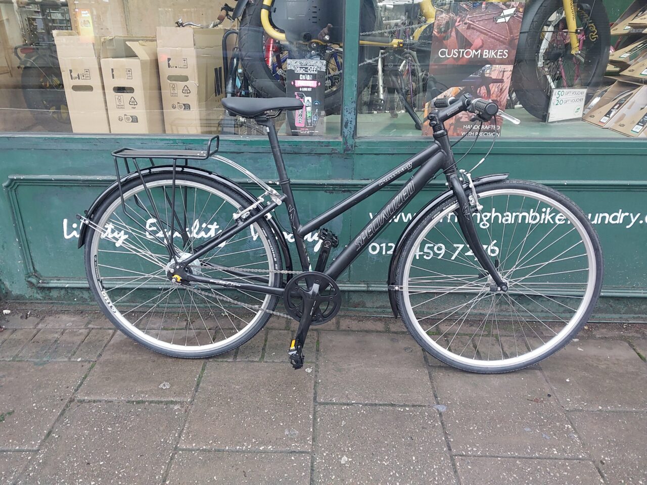 A fantastic small framed commuter bike. New Nexus 8 speed hub, chain, brakes, tyres and mudguards. Set up with rack, full length mudguards and internal gear hub so ideal as a very low maintenance and practical bike for going to work or exercising.